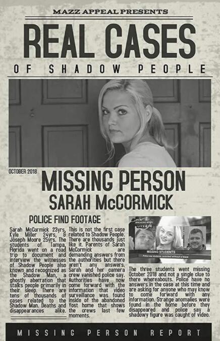 恐怖片影人莎拉·麦考密克的最后一段录像讲述了:2018年10月,三名学生失踪。莎拉·麦考密克,凯尔·米勒,约瑟夫·摩尔。当局现在提供的信息是,在约斯特被遗弃的家中发现了视频监控,显示了工作人员在神秘失踪前最后几分钟记录下影子人物的情况。